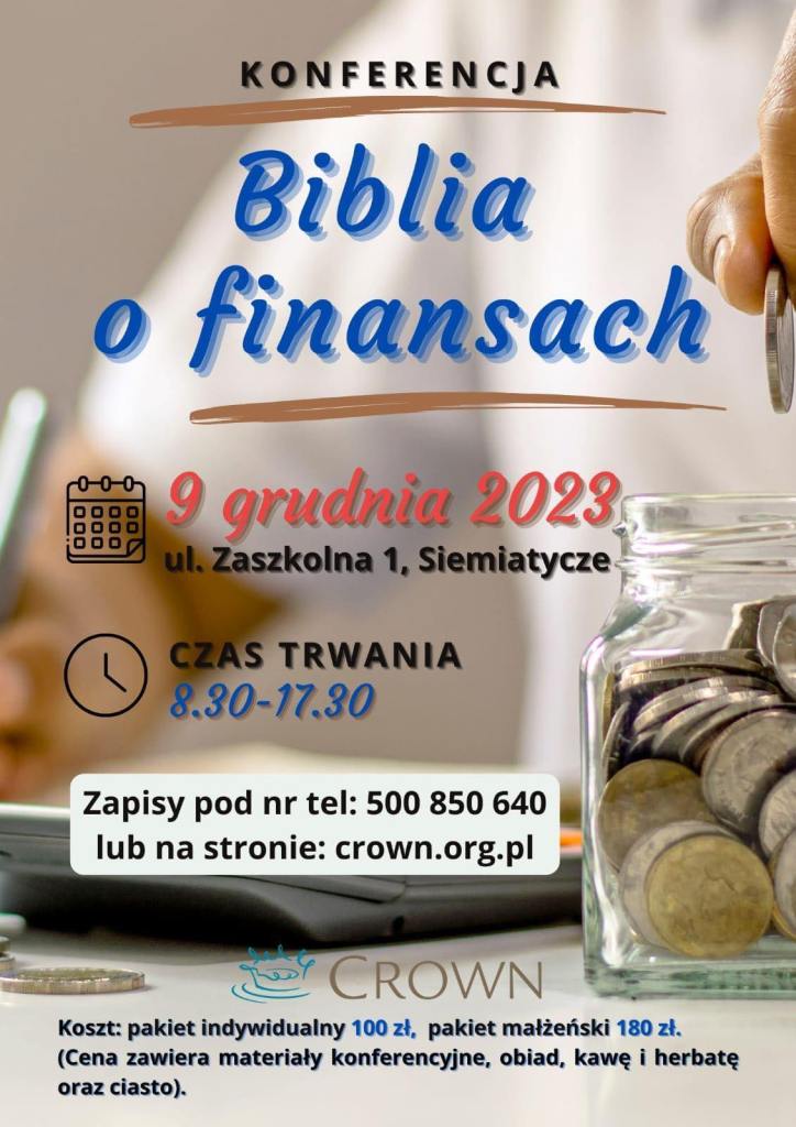 Ogłoszenia 9 grudnia 2023 r. – Konferencja Biblia o Finansach w Siemiatyczach. Date: 28 listopada 2023Author: wrotekela 0 Komentarze Podziel się: Udostępnij na X (Otwiera się w nowym oknie) X Udostępnij w serwisie Facebook (Otwiera się w nowym oknie) Facebook Lubię Wczytywanie…
